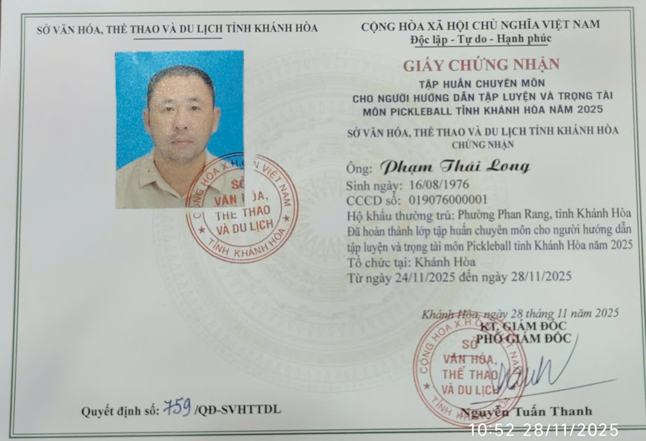 HLV Phạm Long là huấn luyện viên và trọng tài Pickleball được chứng nhận chính thức năm 2025, với mục tiêu lan tỏa phong trào Pickleball chuyên nghiệp, fair-play và bền vững tại địa phương.