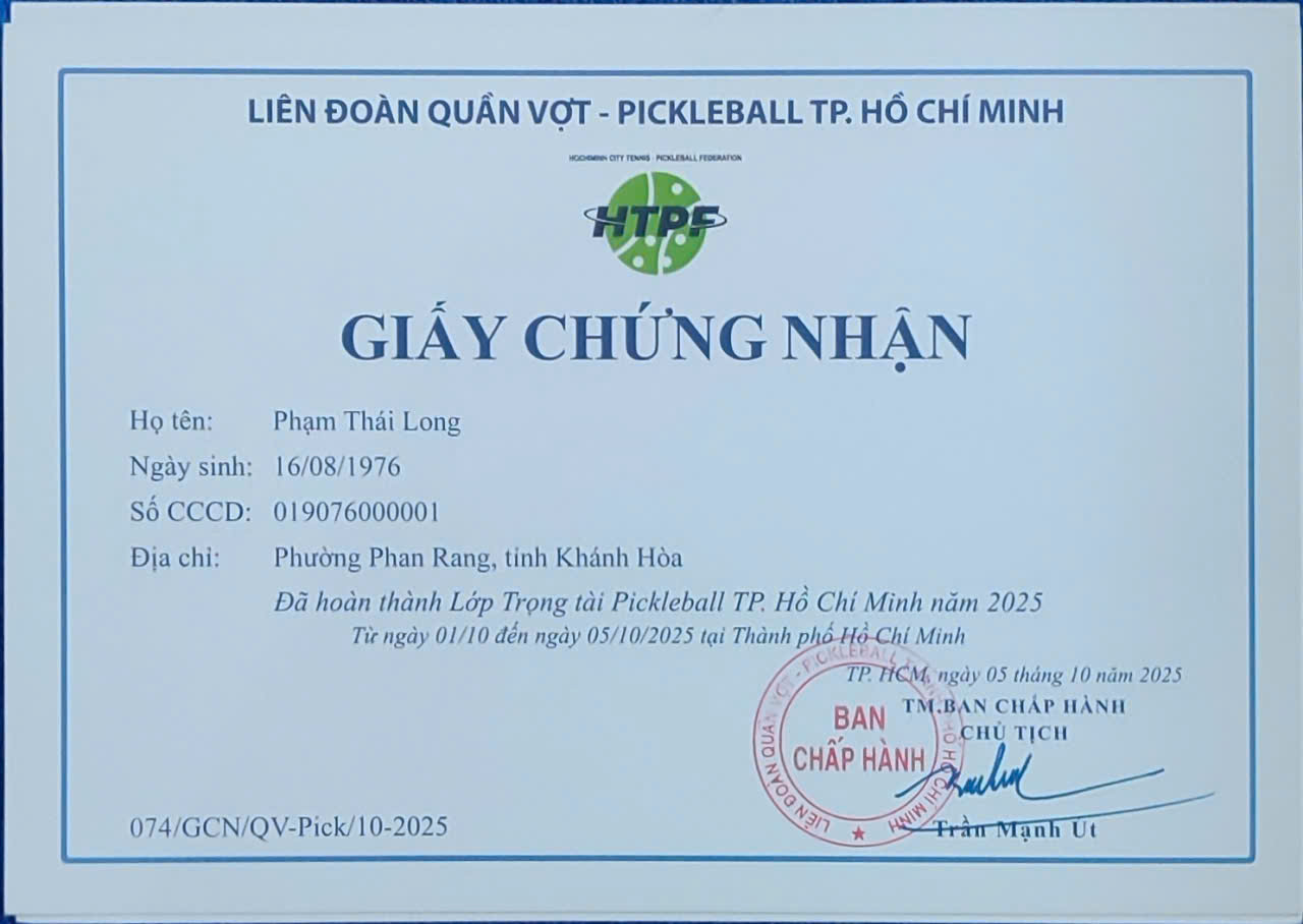 Cấp bởi: Liên đoàn Quần vợt – Pickleball TP. Hồ Chí Minh